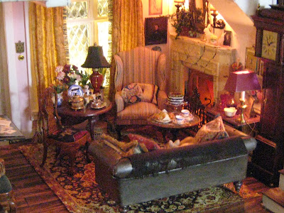 Early in the reconstruction of this dollhouse; long before the wallpaper was hung or the door and window installed, I set about arranging the furniture and accessories to establish the atmosphere and then took countless photos along the way, just so I wouldn't forget what it was supposed to look like later on, since the Best Laid Plans of mice and men, have a habit of sudden changes- don'tcha know! π.....
