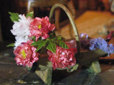 On the floor under table of hydrangeas is a small basket of books, and to the left of the basket, is a rustic bottle basket which was a special gift which Linda hand delivered to me from the Amazing Lidi Stroud BASKETCASE MINIATURES Thank You again Lidi for this Very Special Treasure!