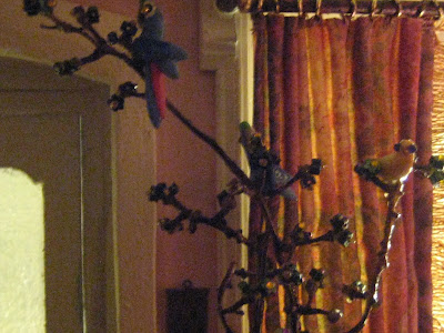 Dear Elizabeth, How many Times and how many ways have I said it....? You are Extraordinary!!! But after the blooming of the Bedroom and the growing of the garden room... the livingroom had to be brought up to standards! And I am so SO glad you knew what you had to do! (I get stuck and paralyzed by the need to undo what I have done....!) You found your way to the beautiful aura of that Era, and I think you Got it!!! The birds are the thing... wild but tamed for the moment... Africa... never really tamed, but we bring home pieces of that dream and want to keep them close! Her daughter gets it with the Bizarre Bird tree!! A Song from Africa.... bold eternal and untameable! And as for the sheer inventiveness and process of Discovery that you show with your transformations of ordinary things... beads and thumbtacks!... Buttons stacked to an improbable African-esque container!...painted Flocked poufs!.... Who could imagine but You?! I am always completely confounded by the range of your expertise with useful materials.... glue, paint, pens, glaze, plaster, printed cloth..... I bow in astonishment at the gorgeous results! Brava! You have tweaked and charmed and hunted and swept and stitched your way to a gorgeous and authentic and deeply "storied" room! I hope you realize, I just Love it! (And thank you for the reminder of the SLOW upload needed for the comment box to work!.... As it is I had to re-do the first sentence or two....) But it's worth the wait! :):):) Thank you for your amazing, bountiful creativity and sharing in blogland! )
